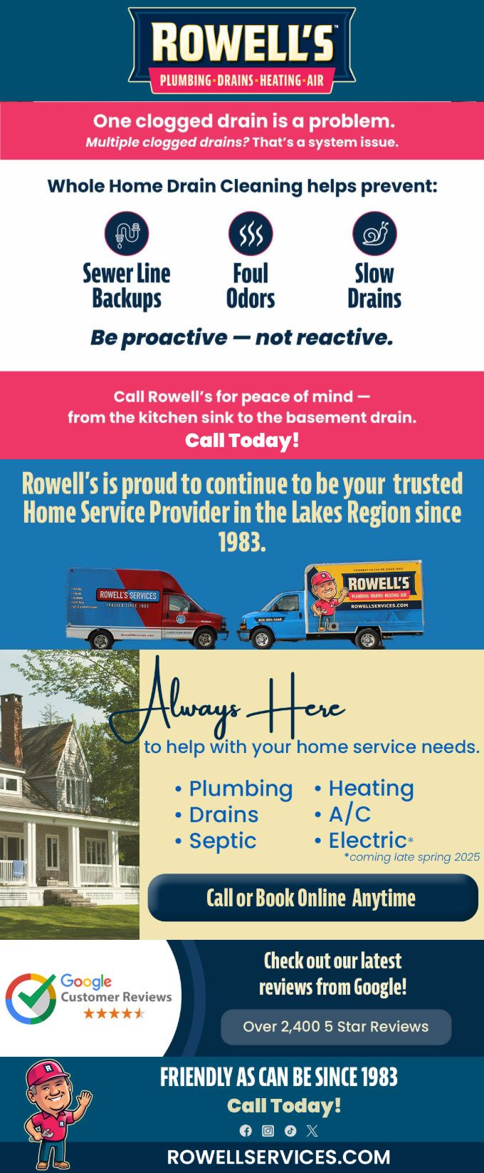 "Friendly As Can Be Since 1983!" When you need help with your plumbing, drains, heating, cooling or electrical in Franklin, you can always rely on Rowell's Services! Call us now or book online!